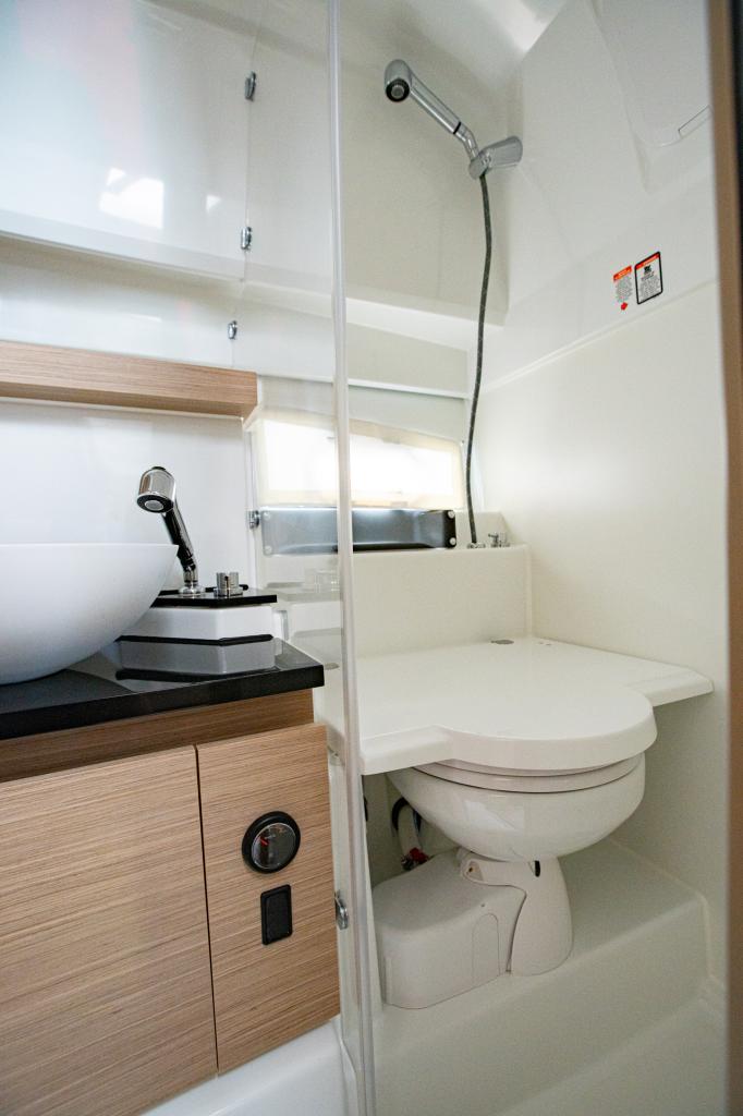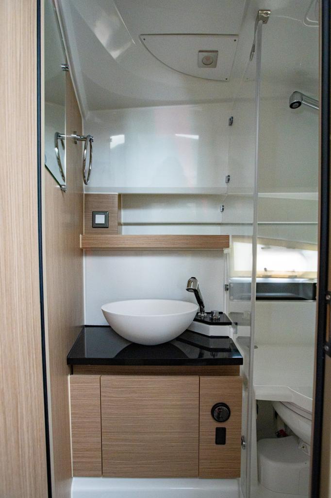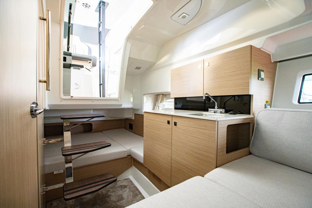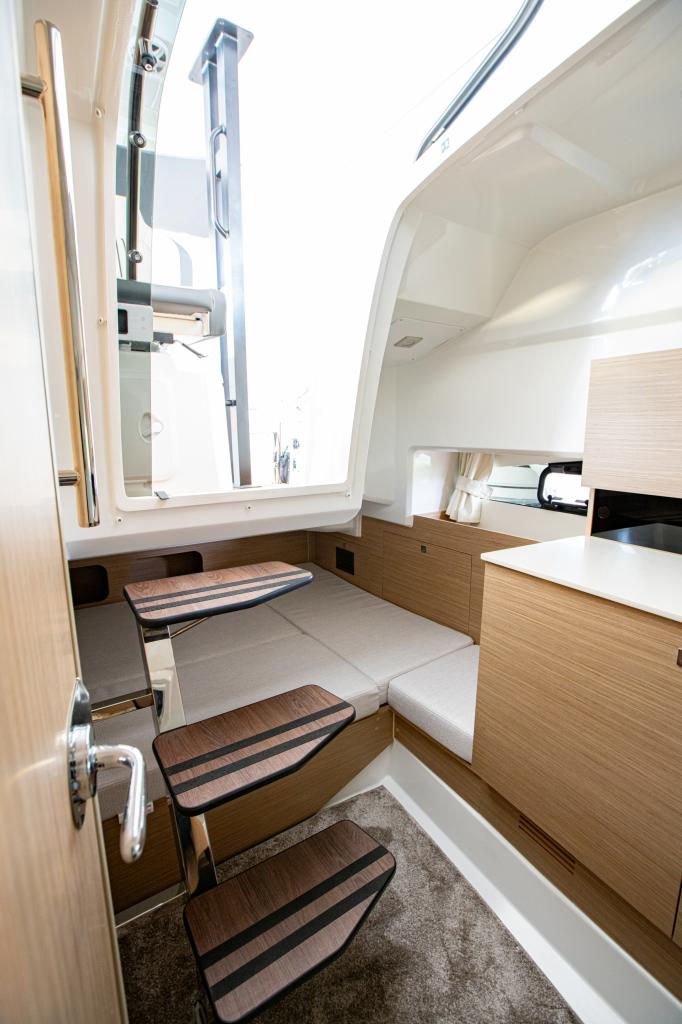 Unter Deck überzeugt der lichtdurchflutete Salon dank grosser Rumpffenster. Er lässt sich in einen komfortablen Doppelschlafplatz umbauen und bietet zusammen mit einem zusätzlichen Doppelbett achtern Platz für Übernachtungen mit Familie oder Freunden. Eine Pantry mit Spüle und Kühlschrank, ein Waschraum mit separater Dusche, elektrischem WC sowie Vorhänge und zahlreiche Staumöglichkeiten runden den Innenraum ab.