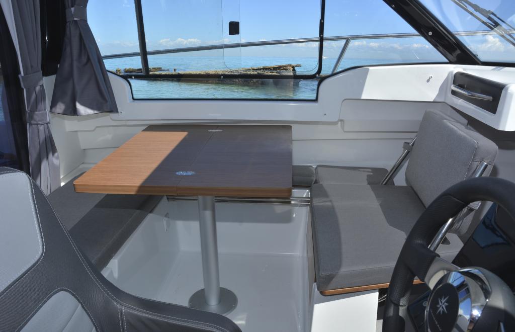 Cockpitsitzgelegenheit in U-Form inkl. Tisch und Sonnenliegepolster (umbaubar zur Sonnenliege); Sonnenverdeck über Cockpit "Sunbrella Graphite"; Verdeck-Set achtern "Sunbrella Graphite"; Halterung am Steuerhaus für Stand Up Paddle; Badeplattform mit Teak; Sonnenliegepolster auf Vorschiff; Elektrische Ankerwinde (ohne Anker); Bugstrahlruder (inkl. Batterie); Druckwassersystem für Version WC-Raum Steuerboard (ohne WC); 220 V Landanschluss + Ladegerät; Pantry Deluxe (Arbeitsplatte in Arpa schwarz, 2x Getränkehalter aus Edelstahl, Gasplatte mit Gasbox); Kühlschrank 42 L (inkl. Batterie); Polster-Erweiterung für Schlafkojen in der Kabine (nur mit Version "geschlossene Kabine"); Teppichset mit Druckknöpfen im Salon; Vorhänge im Steuerhaus; Scheibenwaschanlage; WC-Raum (ohne WC) mit Luke zum öffnen; Marine WC mit Fäkalientank