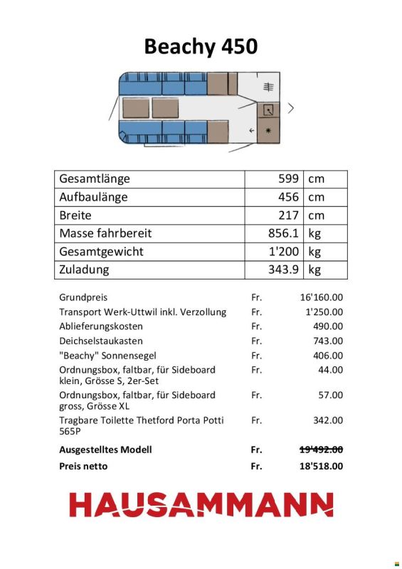 Stoffbezogene Körbe und Spannbänder bieten ordentlich Stauraum. Die Sitzgruppe lässt sich flexibel zum bequemen Schlafbereich umwandeln. Eine kompakte Bugküche mit ausziehbarer Kühlbox und ein begehbarer Kleiderschrank optional ausgestattet mit einem Port a Potti Toilette. Dieses Modell ist auf 1200 kg aufgelastet, mit einem Deichselstaukasten und Sonnensegel ausgestattet.