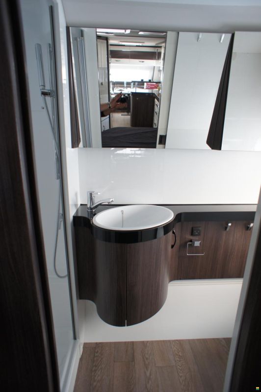 Eine riesige Rundsitzgruppe (umbaubar in Doppelbett) im Bug und ein Queensbett im Heck, beidseitig zugänglich. L-Form Küche mit viel Ablagefläche. Ein grosszügiger Waschraum im Heck mit separater Duschkabine und einer Toilette. Dieses Modell ist auf 2500 kg aufgelastet und mit einer Combiheizung Truma 6E ausgestattet.